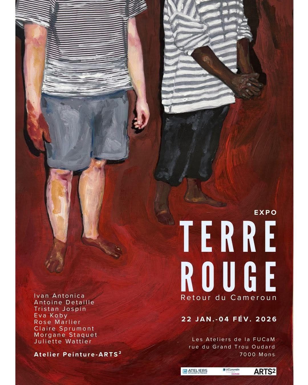 Suite à une résidence internationale croisée à Bandjoun Station (Cameroun), la délégation belge — composée d’étudiant·e·s en master et de professeur·e·s de l’atelier peinture d’ARTS² — présente l’exposition « TERRE ROUGE – Retour du Cameroun » du jeudi 22 janvier au mercredi 4 février 2026 aux Ateliers des FUCaM-UCLouvain en Hainaut.
