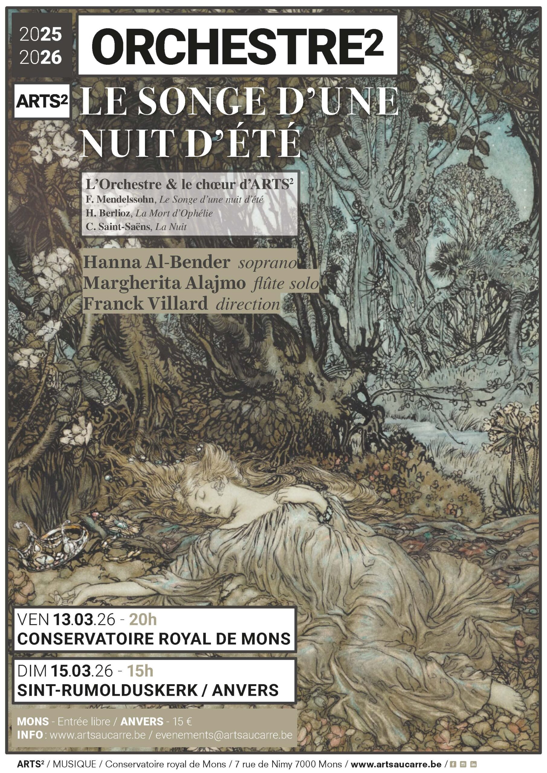 C’est l’été avant l’heure à ARTS2 ! L’orchestre des étudiants du Conservatoire royal de Mons-ARTS2 revient pour un double concert teinté de lyrisme et d’onirisme avec l’iconique Songe d’une nuit d’été de Mendelssohn. Dans la suite du programme, les chanteuses du chœur d’ARTS2 seront à l’honneur avec la déchirante Mort d’Ophélie de Berlioz et la rêverie La Nuit de Saint-Saëns, où l’on accueillera la soprano solo Hanna Al-Bender ainsi que Margherita Alajmo à la flûte solo.