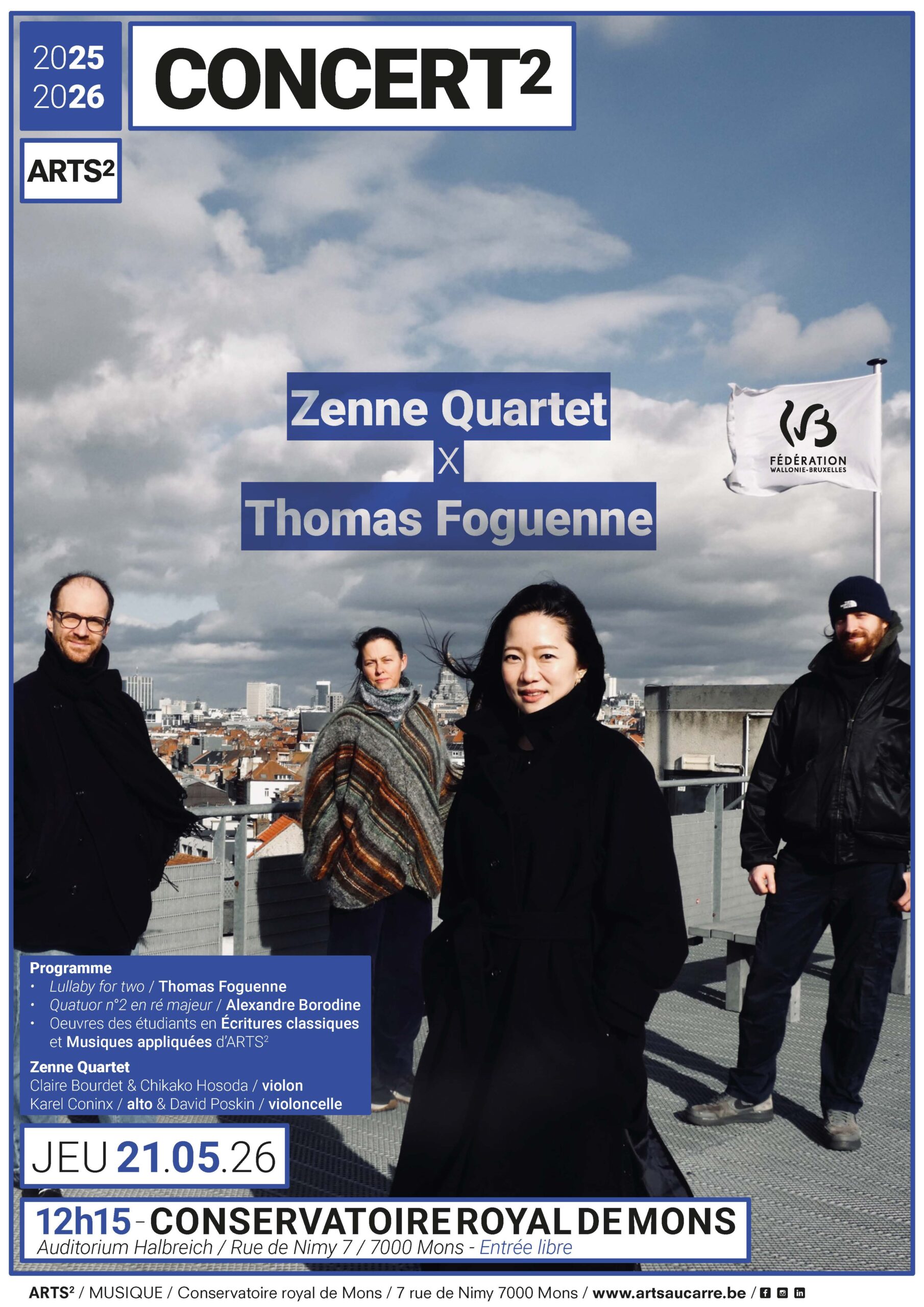 Le Zenne Quartet est depuis plusieurs années le partenaire privilégié du Master en écritures classiques de Thomas Foguenne du Conservatoire royal de Mons. Nous avons le plaisir de l’accueillir cette année encore pour un concert de midi alliant musique classique, musique de création et présentation des réalisations des étudiants des classes d’Écritures classiques et de Musiques appliquées d’ARTS².